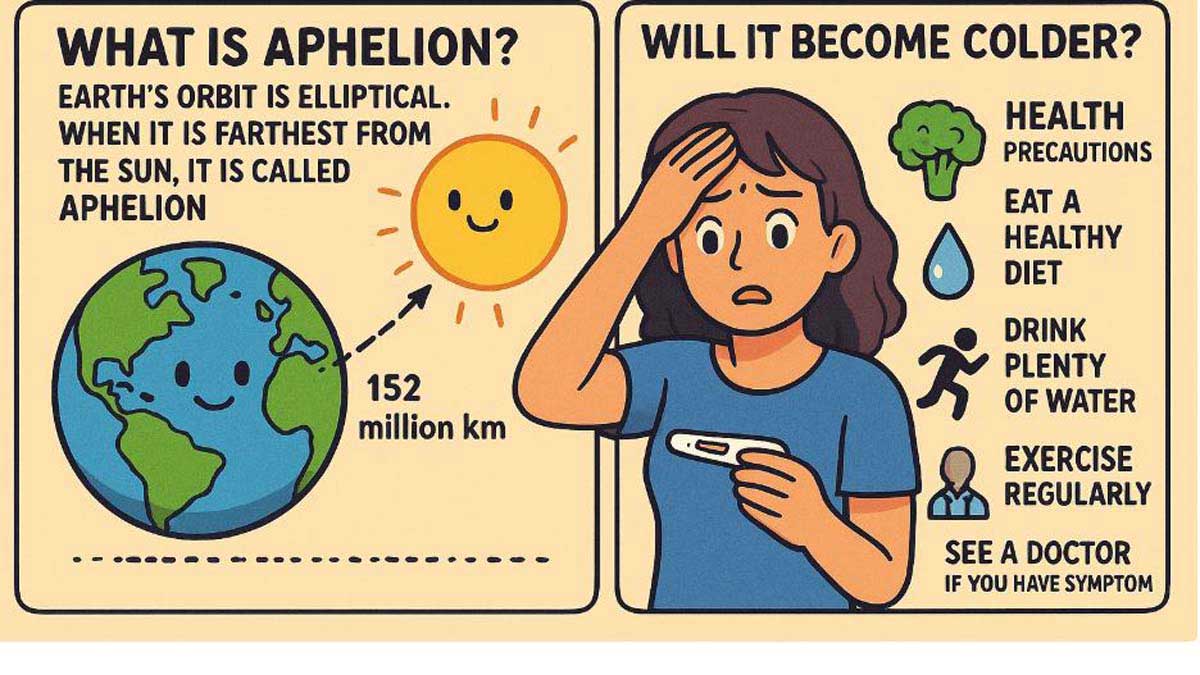 ఈ సమయంలో భూమి సూర్యుడి నుంచి సుమారు 152 మిలియన్ కిలోమీటర్ల దూరంలో ఉంటుంది. ఈ సమయంలో మునుపెన్నడూ అనుభవించని విధంగా చల్లని ఉష్ణోగ్రతలు ఉండవచ్చు. దీంతో శరీర నొప్పులు, గొంతు రాపిడి, జ్వరం, దగ్గు, శ్వాస సంబంధిత సమస్యలు రావచ్చు. కానీ, శాస్త్రవేత్తలేమంటారంటే.. భూమి సూర్యుడికి దూరంగా ఉన్నప్పుడు వాతావరణం చల్లగా మారుతుందని కొందరనుకుంటారు.