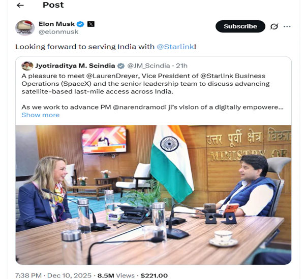 Elon Musk: భారత్‌(India)లో శాటిలైట్ ఆధారిత ఇంటర్నెట్ సేవల(Satellite-based internet services) రంగంలో పెద్ద మార్పులకు వేదిక సిద్ధమవుతున్నట్టు కనిపిస్తోంది. ఎలాన్ మస్క్‌ నుంచి వచ్చిన చిన్న ట్వీట్ కూడా స్టార్‌లింక్(Starlink) భారత ప్రవేశంపై పెద్ద చర్చ ప్రారంభించింది. త్వరలో దేశవ్యాప్తంగా తమ సేవలను అందించేందుకు స్టార్‌లింక్ సన్నాహాలు చేస్తున్నట్టు ఆ వ్యాఖ్య సంకేతాలు ఇస్తోంది. ముఖ్యంగా ప్రభుత్వంతో జరుగుతున్న తీవ్ర చర్చల సమయంలోనే మస్క్ స్పందించడం పరిశ్రమలో మరింత ఆసక్తిని రేకెత్తించింది. ఇటీవలి స్టార్‌లింక్ గ్లోబల్ వైస్ ప్రెసిడెంట్ లారెన్ డ్రేయర్, కేంద్ర మంత్రి జ్యోతిరాదిత్య సింధియాను న్యూఢిల్లీలో ప్రత్యక్షంగా కలిసిన విషయం కీలకంగా మారింది. గ్రామీణ మరియు డిజిటల్‌గా వెనుకబడిన ప్రాంతాల్లో శాటిలైట్ ఇంటర్నెట్ వినియోగాన్ని పెంచడం ప్రధాన లక్ష్యంగా ఈ భేటీ జరిగిందని సింధియా వివరించారు. సంప్రదాయ టెలికాం మౌలిక సదుపాయాలు అందని ప్రదేశాల్లో ప్రజలకు వేగవంతమైన నెట్‌వర్క్‌ అందించడంలో శాటిలైట్ టెక్నాలజీ కీలక పాత్ర పోషిస్తుందని ఆయన పేర్కొన్నారు.